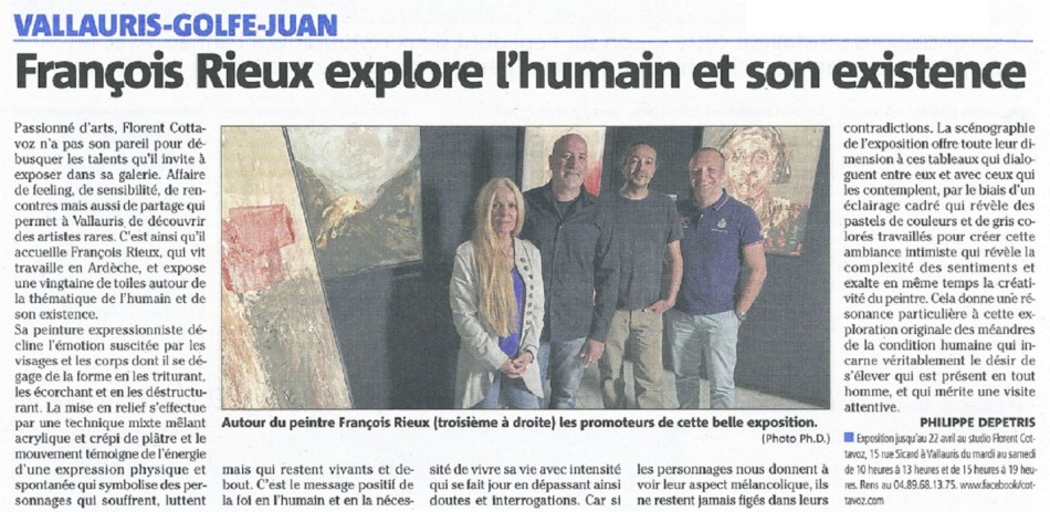 NICE MATIN - VALLAURIS-GOLFE-JUAN 19 avril 2019 - France - Quotidien Journaliste : PHILIPPE DEPETRIS - Tous droits réservés à l'éditeur. François Rieux explore l’humain et son existence Passionné d’arts, Florent Cottavoz n’a pas son pareil pour débusquer les talents qu’il invite à exposer