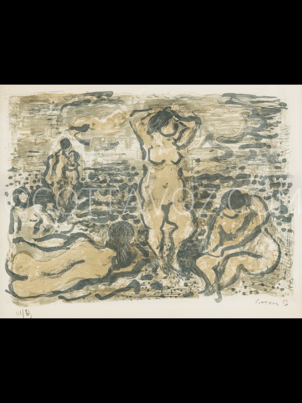 Présentation par Florent : les baigneuses, lithographie sur plaque de zinc ou les formes généreuses d’un modèle féminin propre à Cottavoz, ici, au bord de mer en lavis et bichromie.